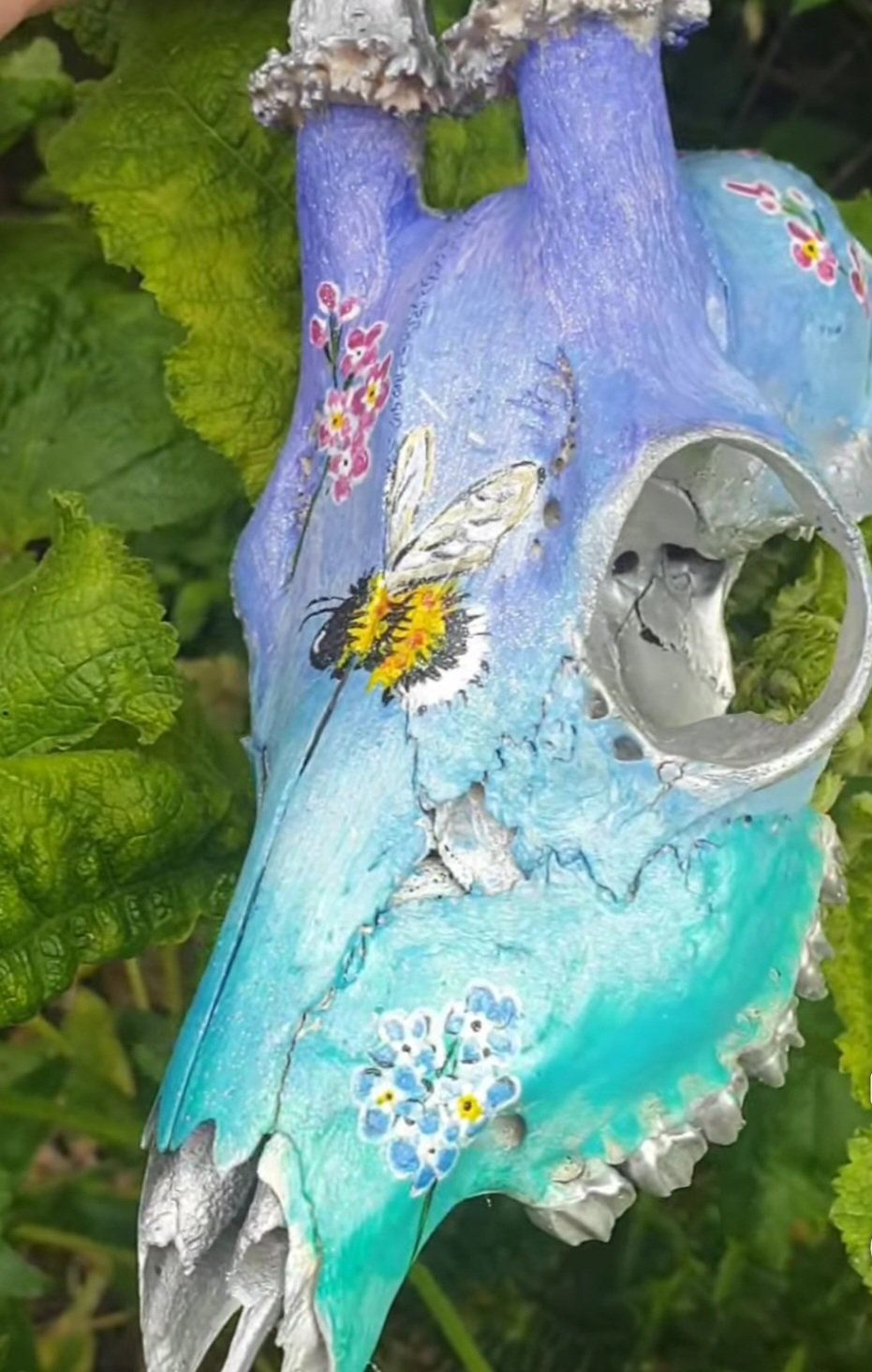 Hand painted deer skull with forget-me-nots and bumble bees in iridescent springtime colours with silver antlers and flecks of sparkle