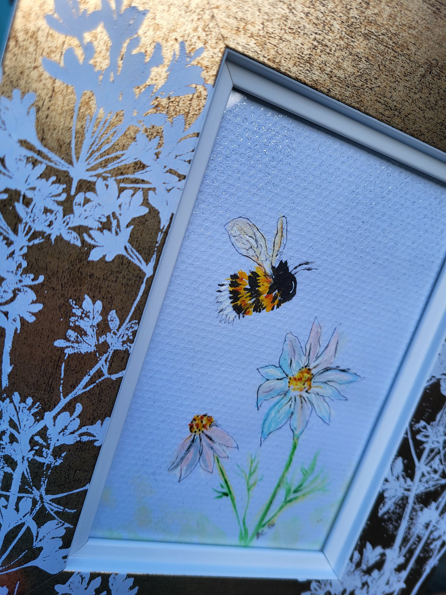 A sparkling iridescent little original watercolour painting of a bee and wildflowers in a striking gold frame, 19 x 24cm. Can stand or hang